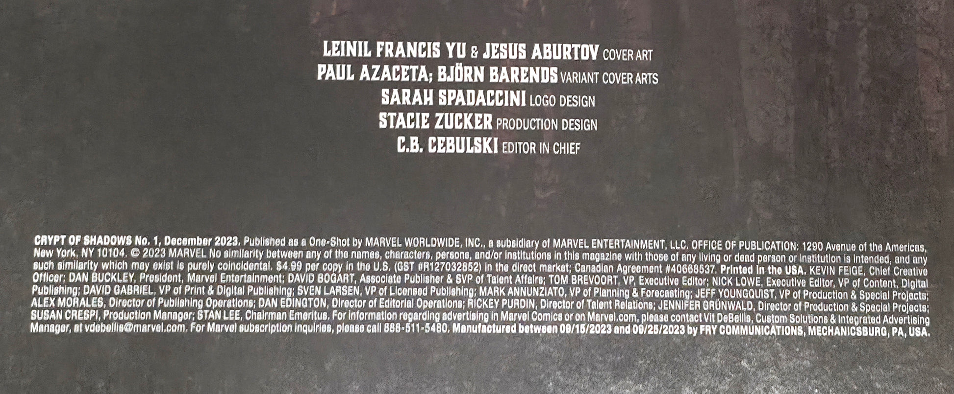 Crypt of Shadows #1 (2023) Variant Edition 1:25 Bjorn Barends NEAR MINT Marvel